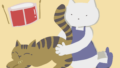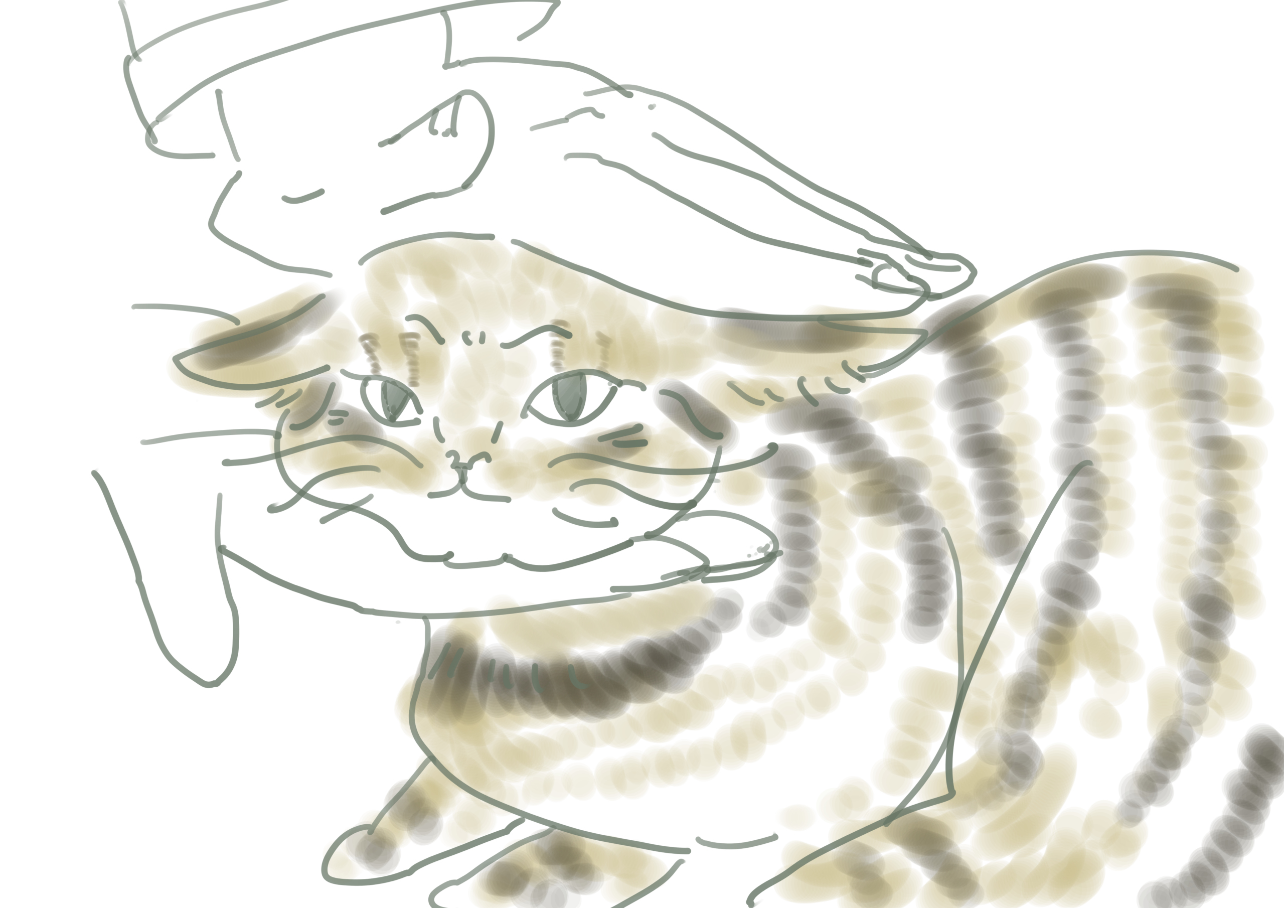 ねこをメンチカツバーガーにする人間の手と、ねこのスケッチ。